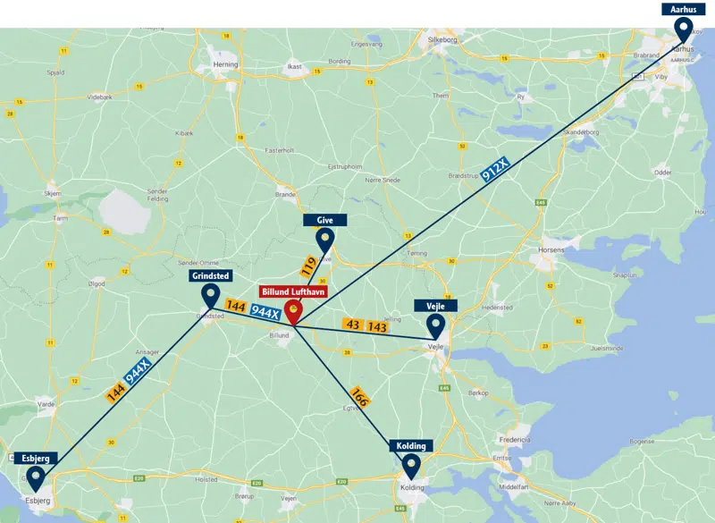 The map shows the direct bus routes to and from Billund Airport. Below you will find information on timetables, prices and tickets for each city.
