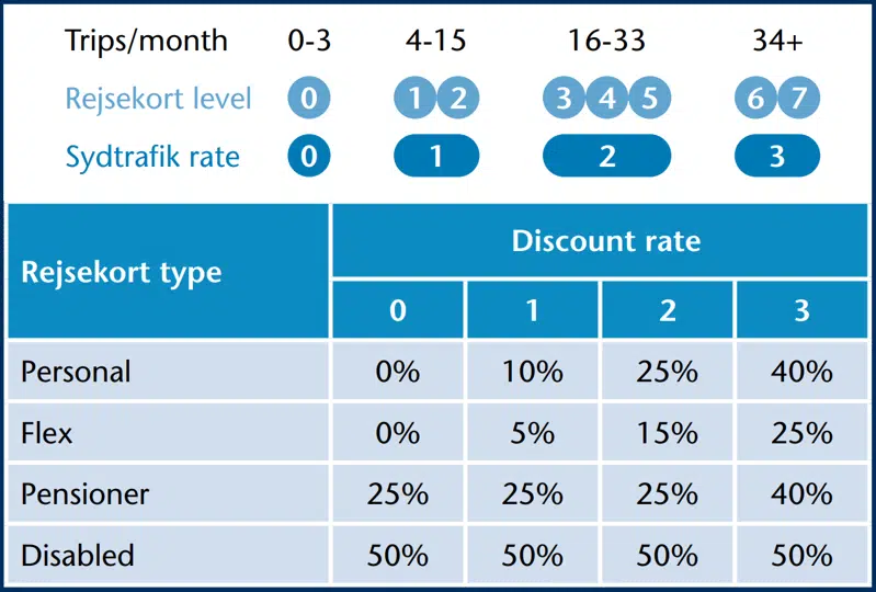 The table shows your discount rate and how Sydtrafk and rejsekort levels correspond.